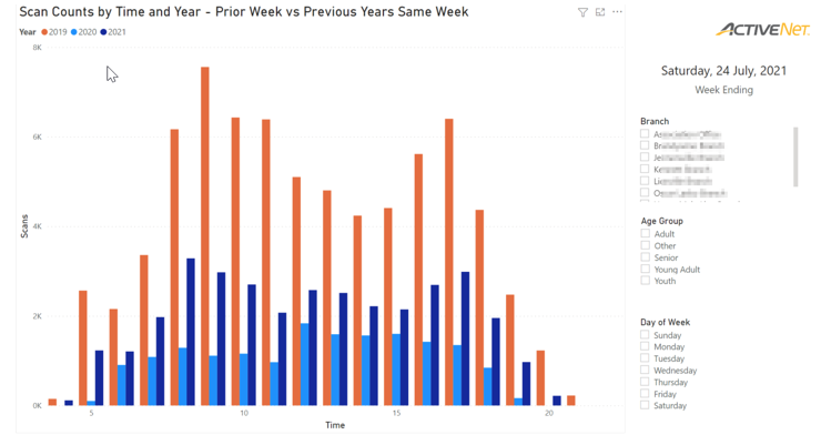 Below is an example of a dashboard showing scan activity from an ACTIVENet Hub database. The visual make it easy to understand how this organization is tracking. Notice the comparison to pre-pandemic times showing the progress of recovery. The structure of Hub data makes these easy to put together.