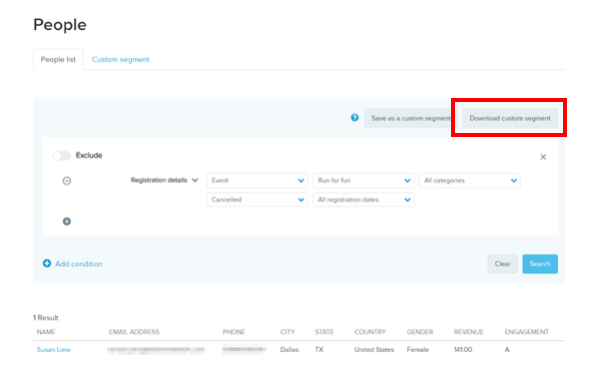- Download a custom segment report from the People tab (CRM) so you can upload them into your social platforms for marketing purposes.