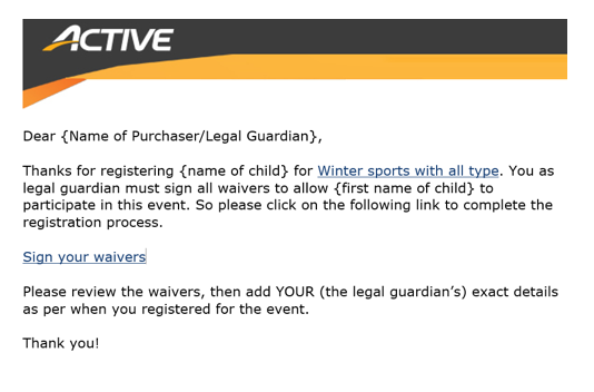 - Updated email flow where waivers are sent to legal guardians/parents post registration. New verbiage and specificity aims to reduce confusion and eliminate those customer service queries teams when you have minors/children in your event (another great recommendation from our clients' feedback).