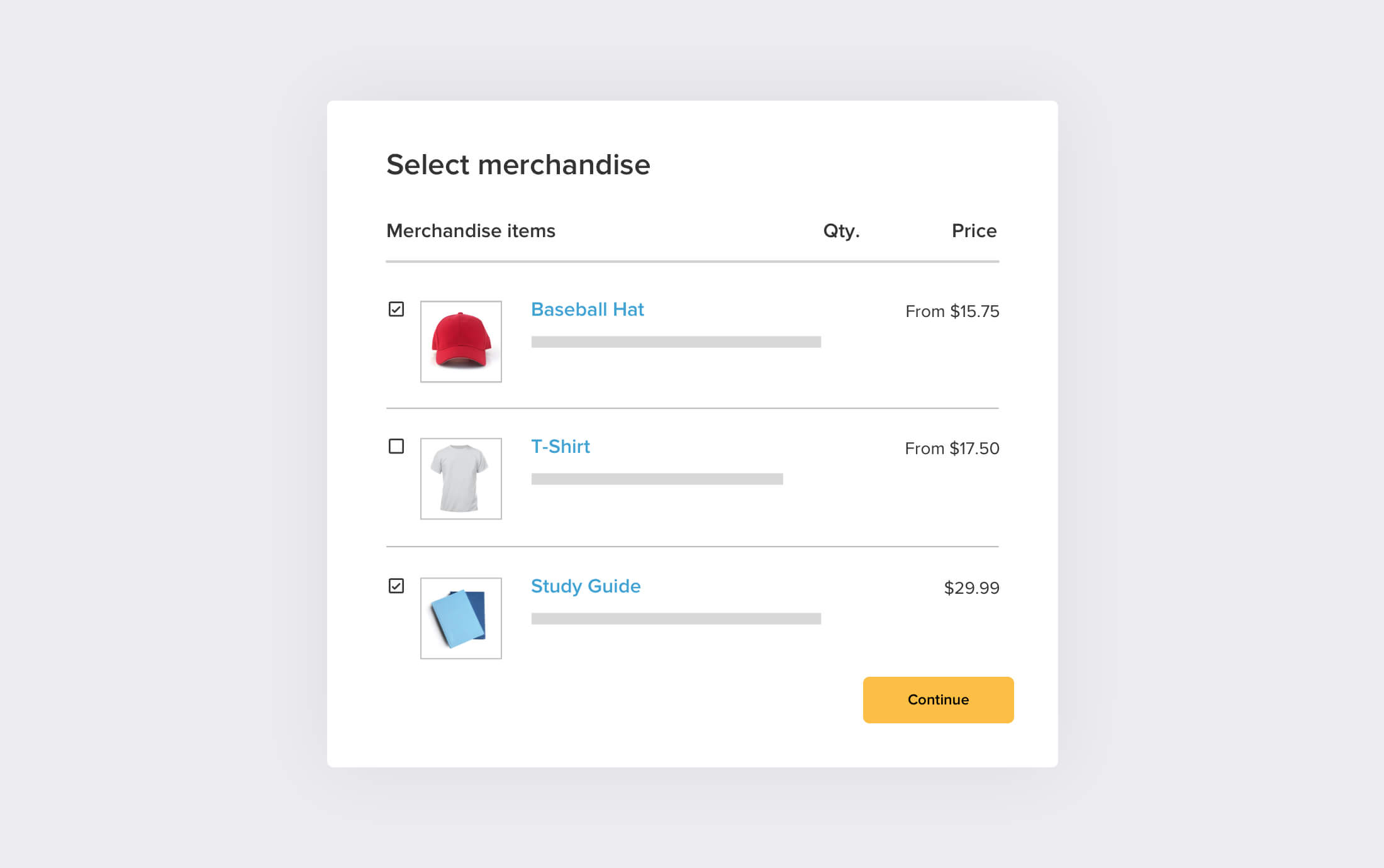 Offer gear directly at check out. Merchandise quantities are automatically updated after each purchase, eliminating time-consuming administrative work. Track merchandise contribution to revenue with merchandise reports.