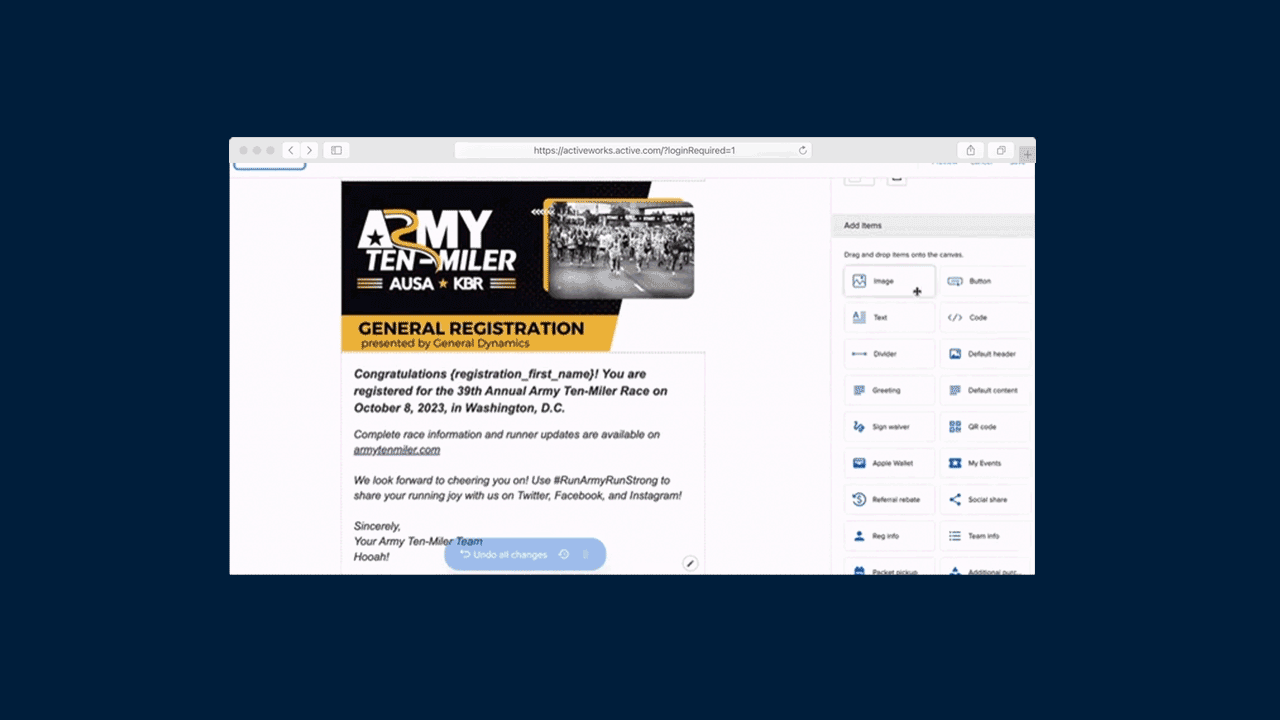 With this new update, you can create confirmation emails that are fully designed by your team, with content arranged as needed for your event. You can insert your own marketing elements, highlights, and event info, and of course combine that with the standard confirmation email elements like registration details, OnSite check-in QR Code, additional purchases, and team info. Â
