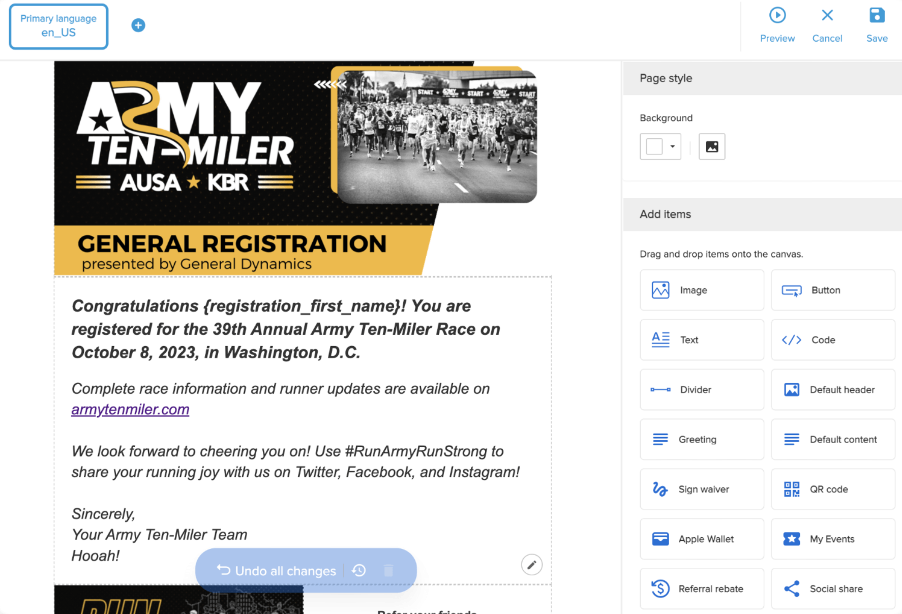 Easily add your event's referral links to encourage your recently registered participants to share and invite their friends to grow your event. The possibilities with our email customization options are endless! Â