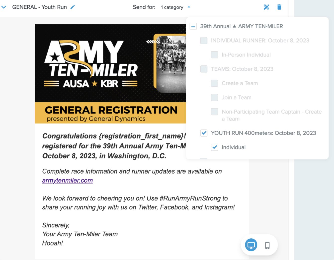 Using fully custom emails, you can create multiple confirmation emails for different categories. For example, if you have a charity race category, you can create a custom confirmation email specifically for that category so that all charity runners get an email tailored just for them.